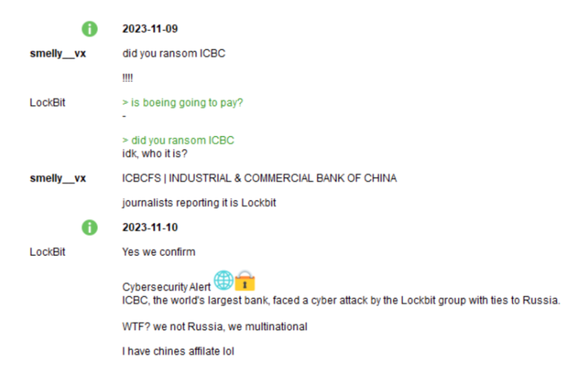 安全研究平台VXunderground透露,LockBit组织代表在Tox(匿名通信软件)上公开承认对本次工商银行勒索事件负责,但否认自己是俄罗斯黑客组织。