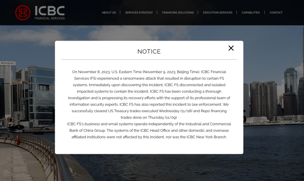 11月10日,中国工商银行股份有限公司在美全资子公司工银金融服务有限责任公司(以下简称“工银金融”)官网发布声明称,美东时间11月8日,工银金融遭勒索软件攻击,导致部分金融服务业务中断。
